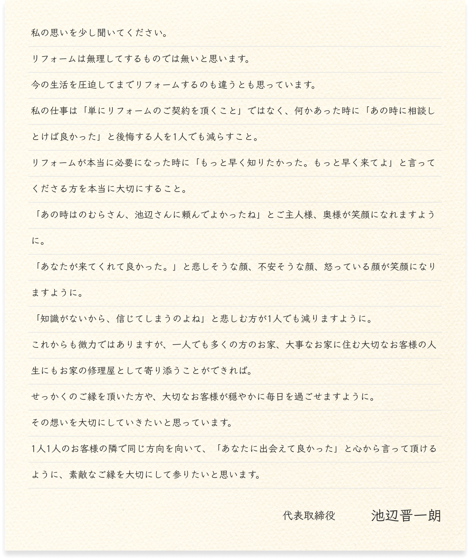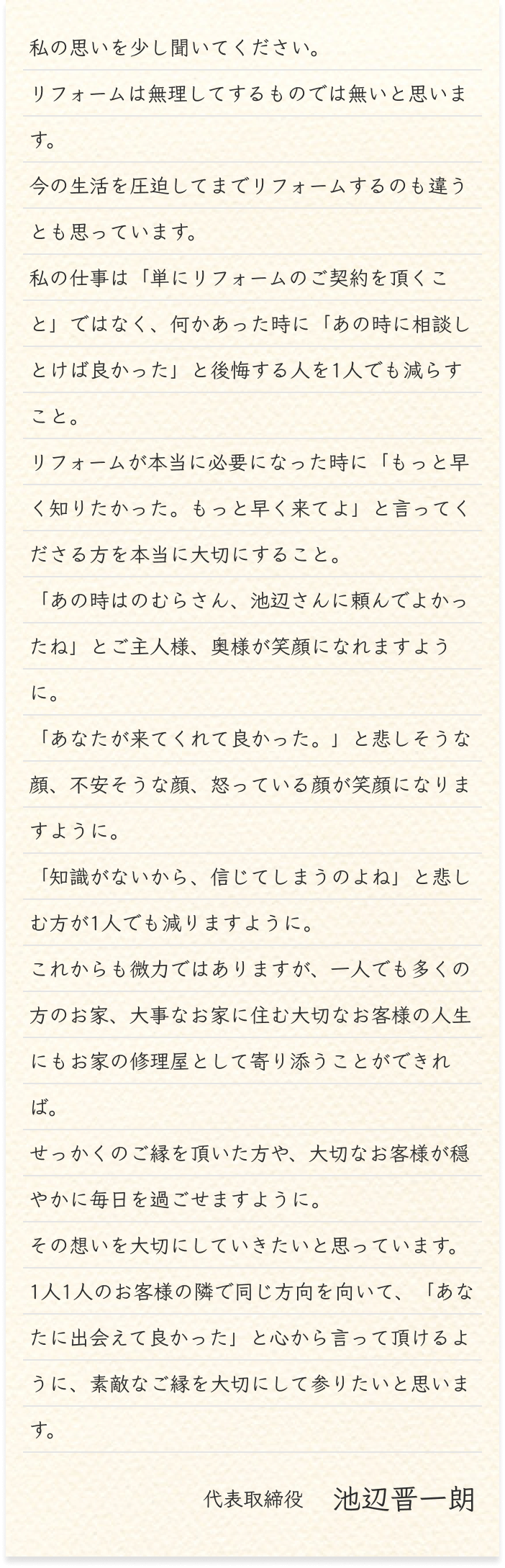 近所の家のリフォームを見て、トベシンホームに依頼しました。対応が迅速で、見積りも丁寧でした。水回りの修繕もできるので、また利用したいです。感謝しています。